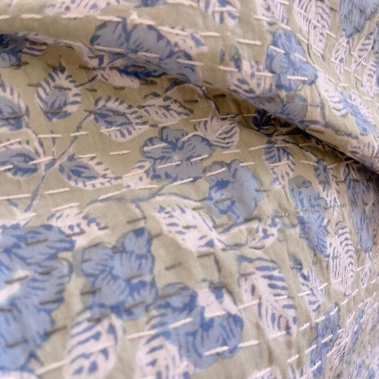 ほんのりグリーン地の素敵なお花柄のブロックプリントキルトです。