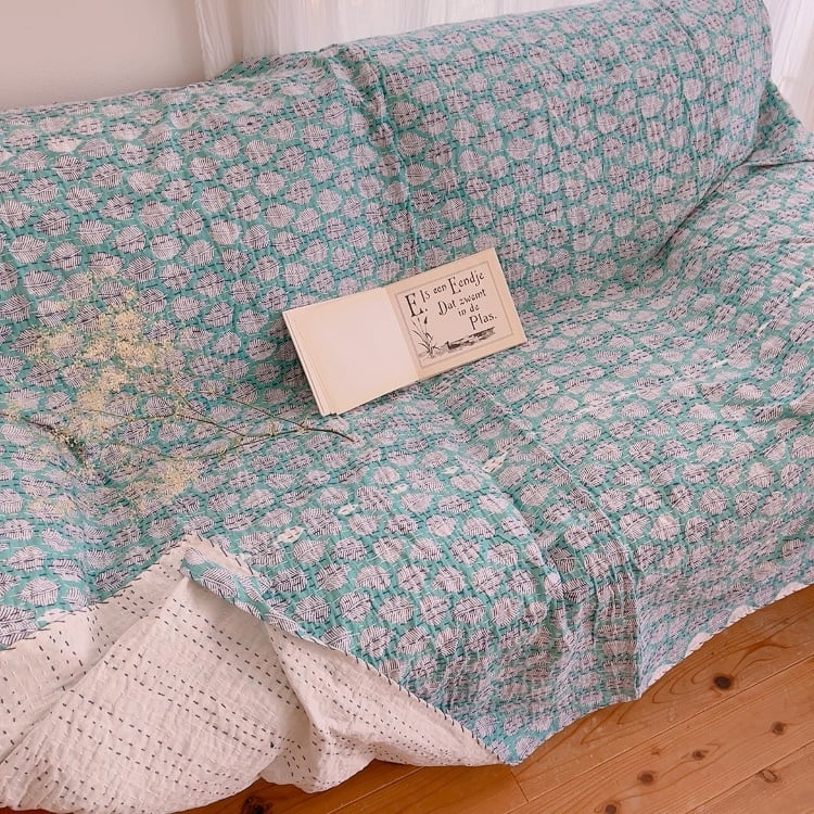 (M)グリーンリーフ ブロックプリントキルト ベッドカバー ソファーカバー カンタキルト