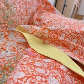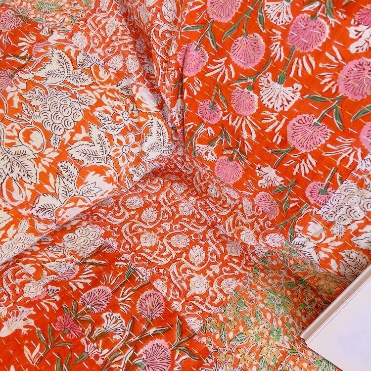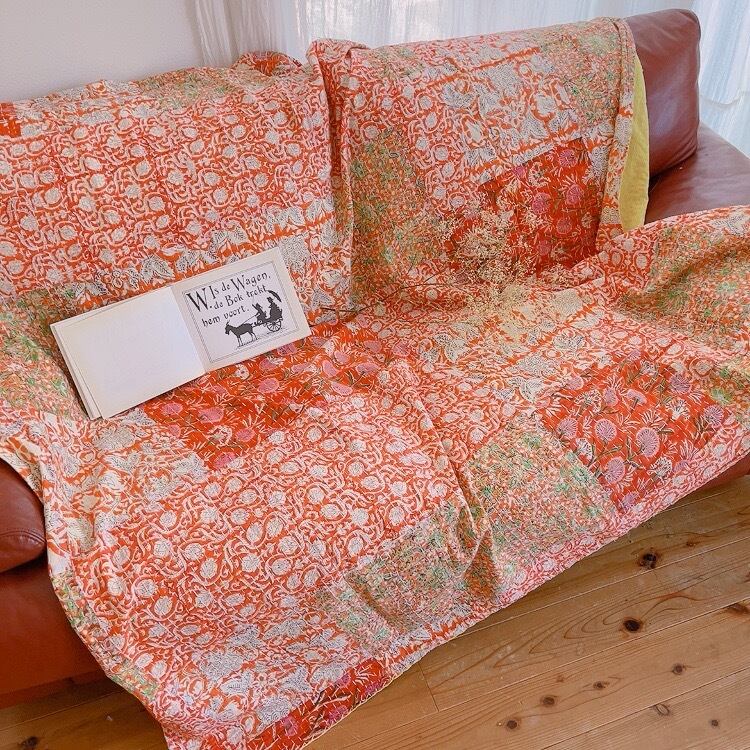 【M】jucyオレンジパッチワークキルト ブロックプリントキルト