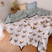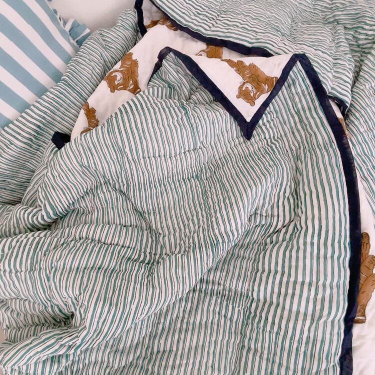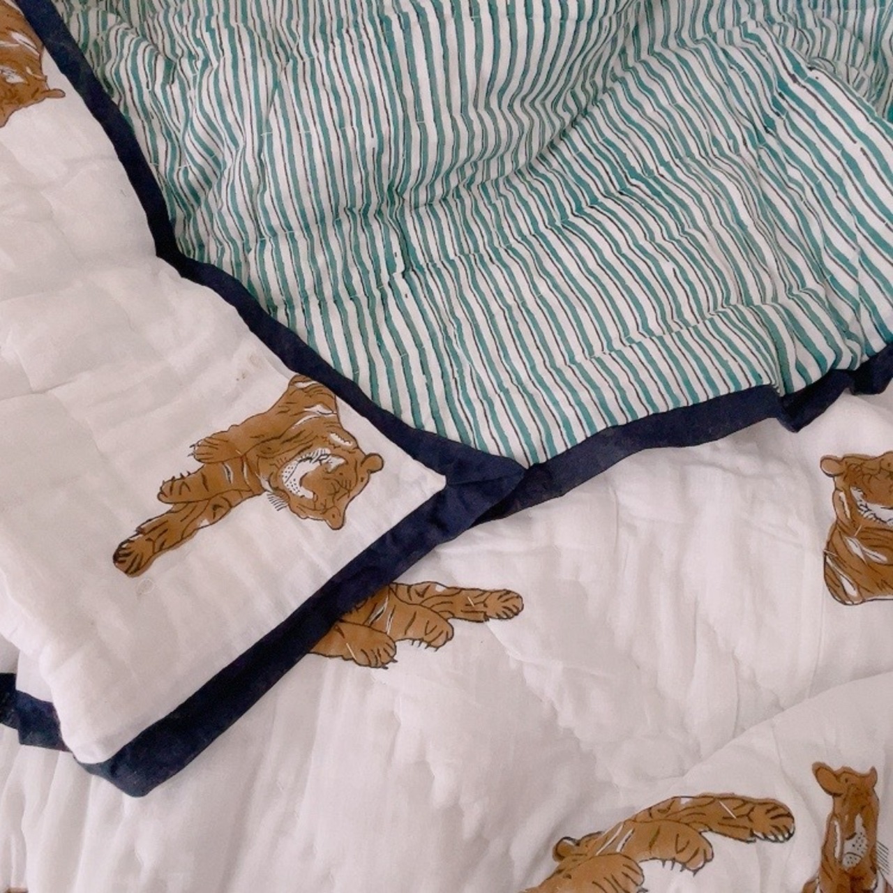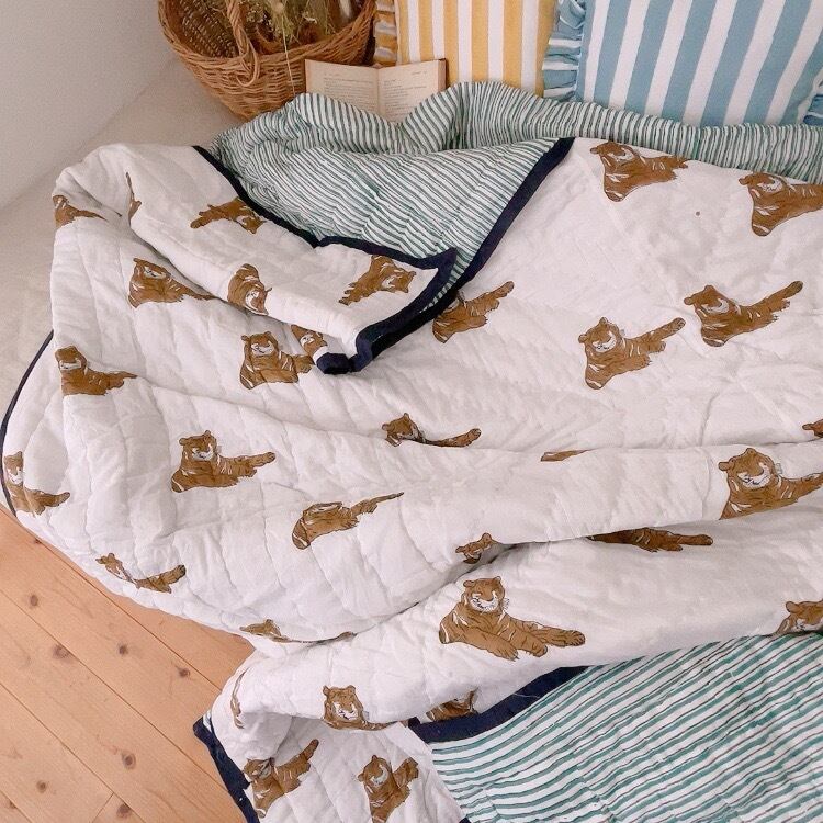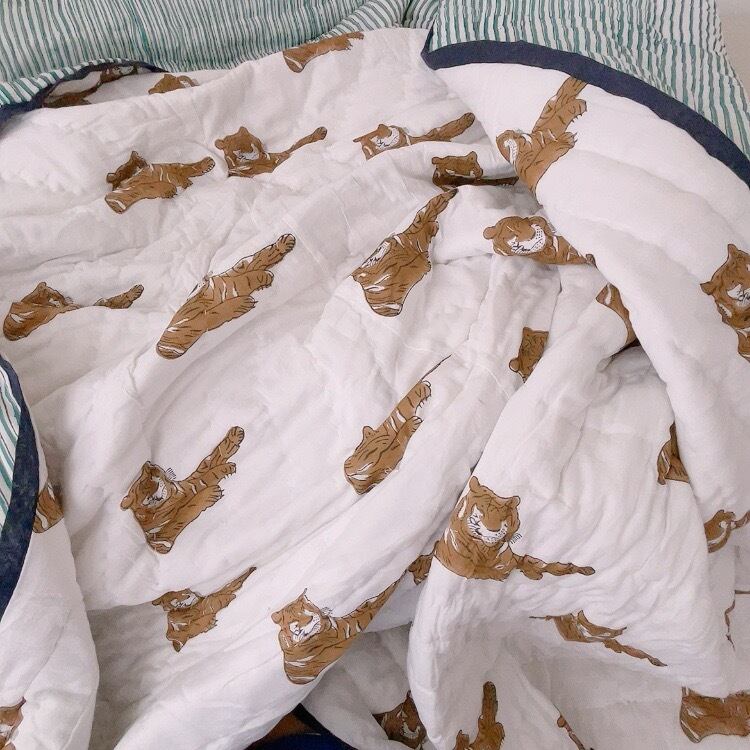 トラ柄がほっこりユニークなブロックプリントの綿入りキルトです。