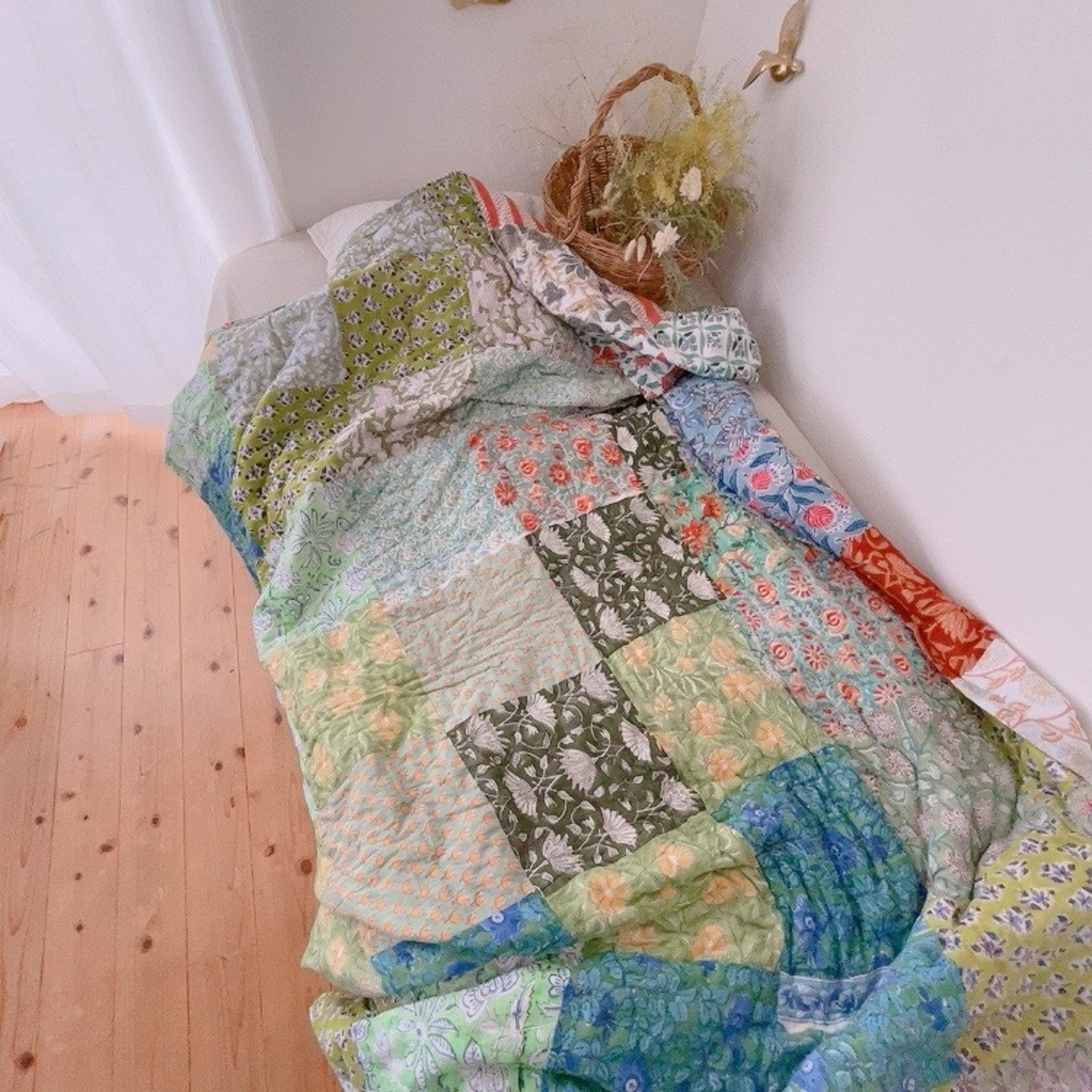 綿入り【M】カラフル×グリーンパッチワークキルト(A)