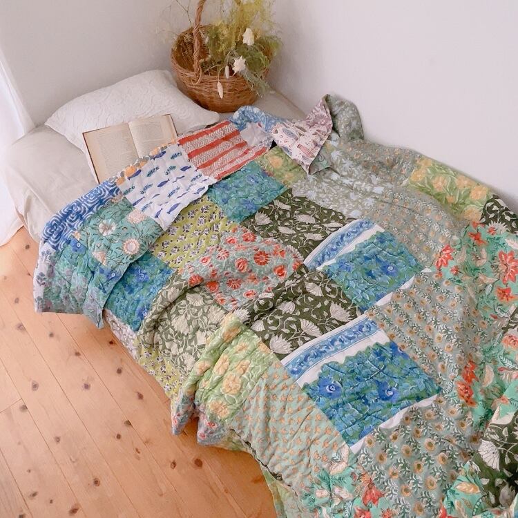 片面はカラフルなパッチワーク、もう片面はグリーン系のブロックプリント生地を集めた
