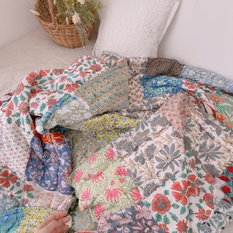 片面はカラフルなパッチワーク、もう片面はグリーン系のブロックプリント生地を集めた