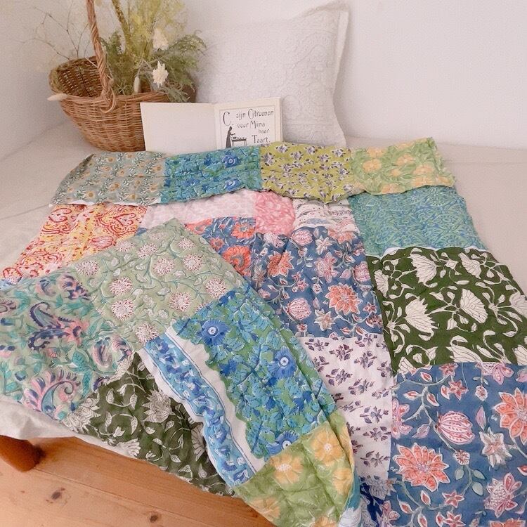 片面はカラフル系、もう片面はグリーン系のブロックプリント生地を集めた
