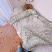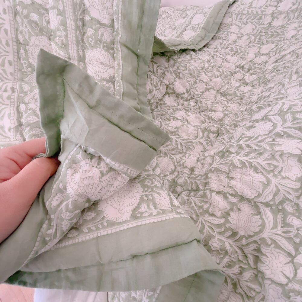 綿入り【M】グリーンローズ ブロックプリントキルト