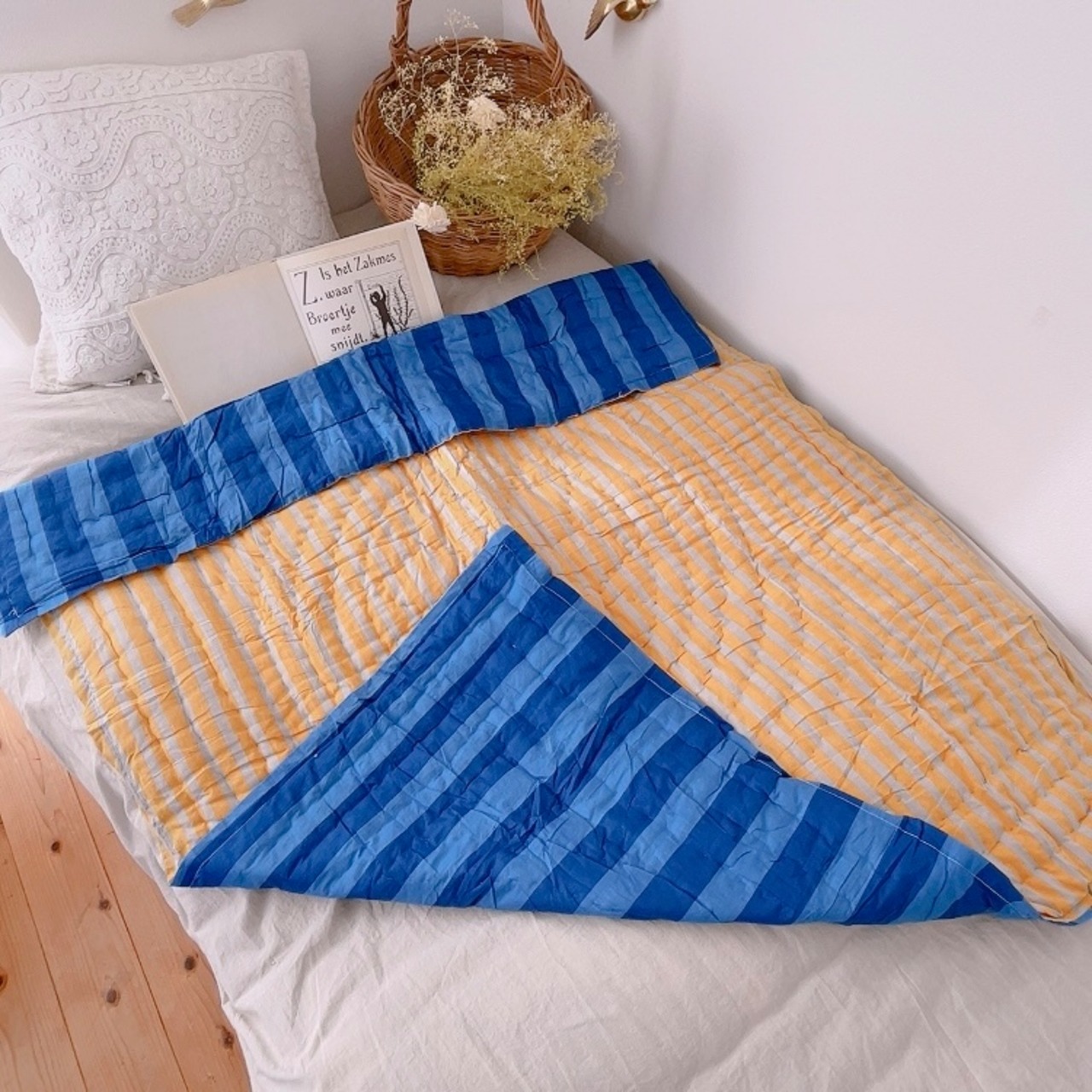 しましまストライプのおしゃれなブロックプリントの綿入りキルトです。