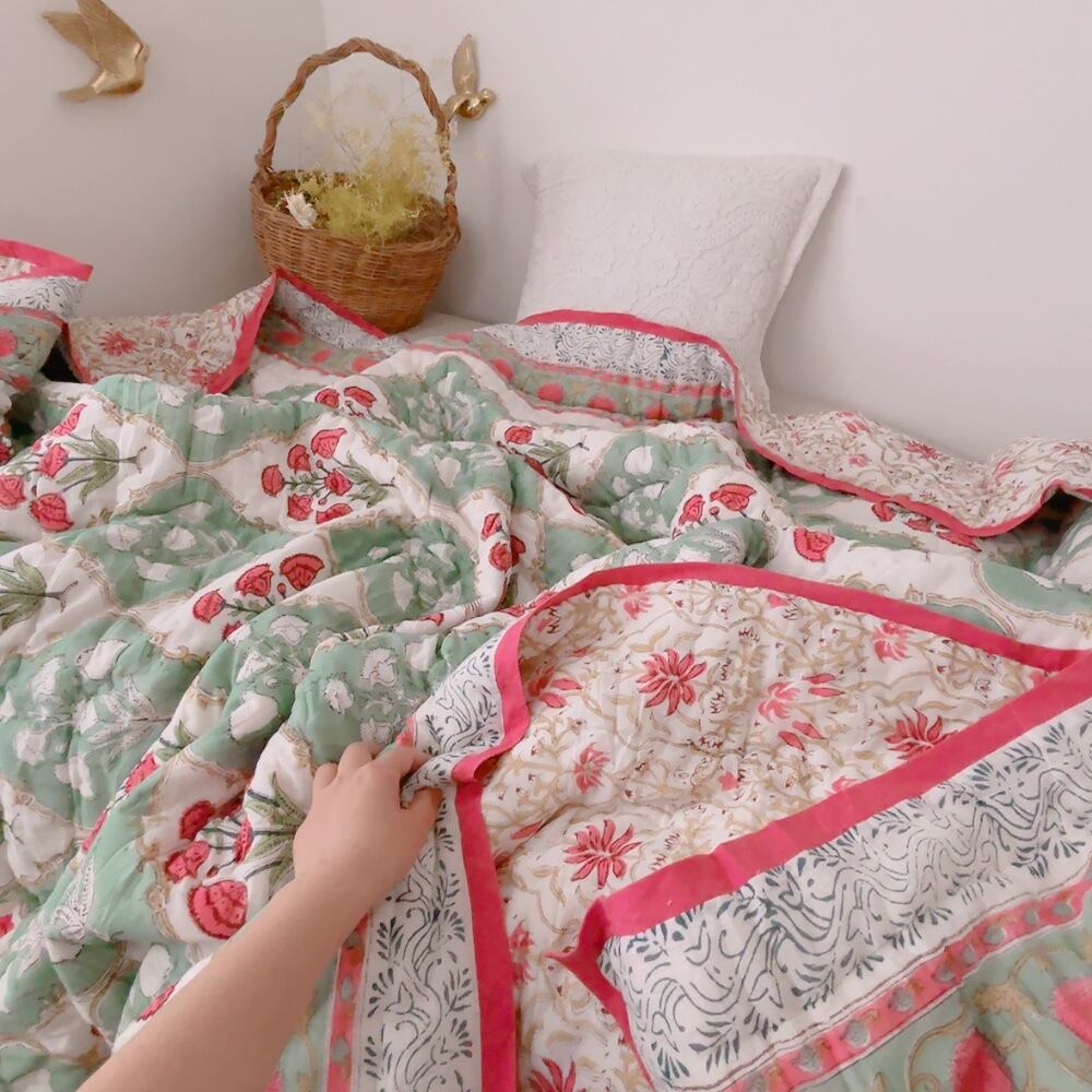 とても可愛らしいお花柄のブロックプリントの綿入りキルトです。