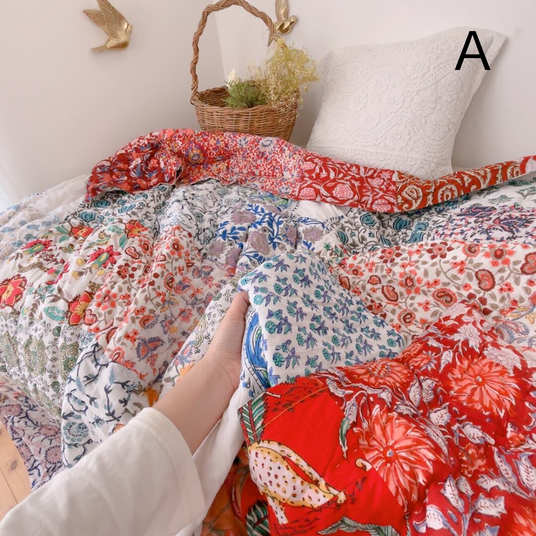 片面はホワイト系のブロックプリントを集めたパッチワーク、もう片面はレッド系のブロックプリント生地を集めたパッチワークの綿入りキルトです。
