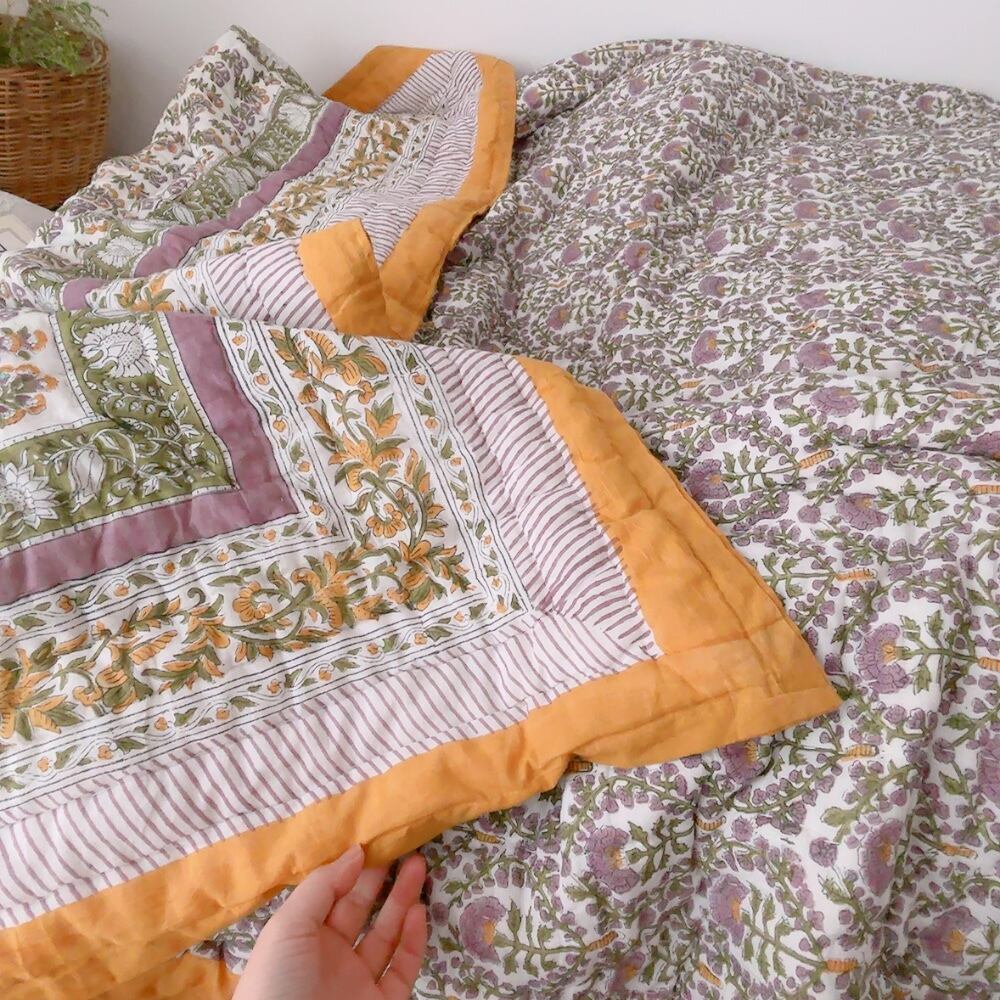 綿入り【M】パープルフラワー ブロックプリントキルト