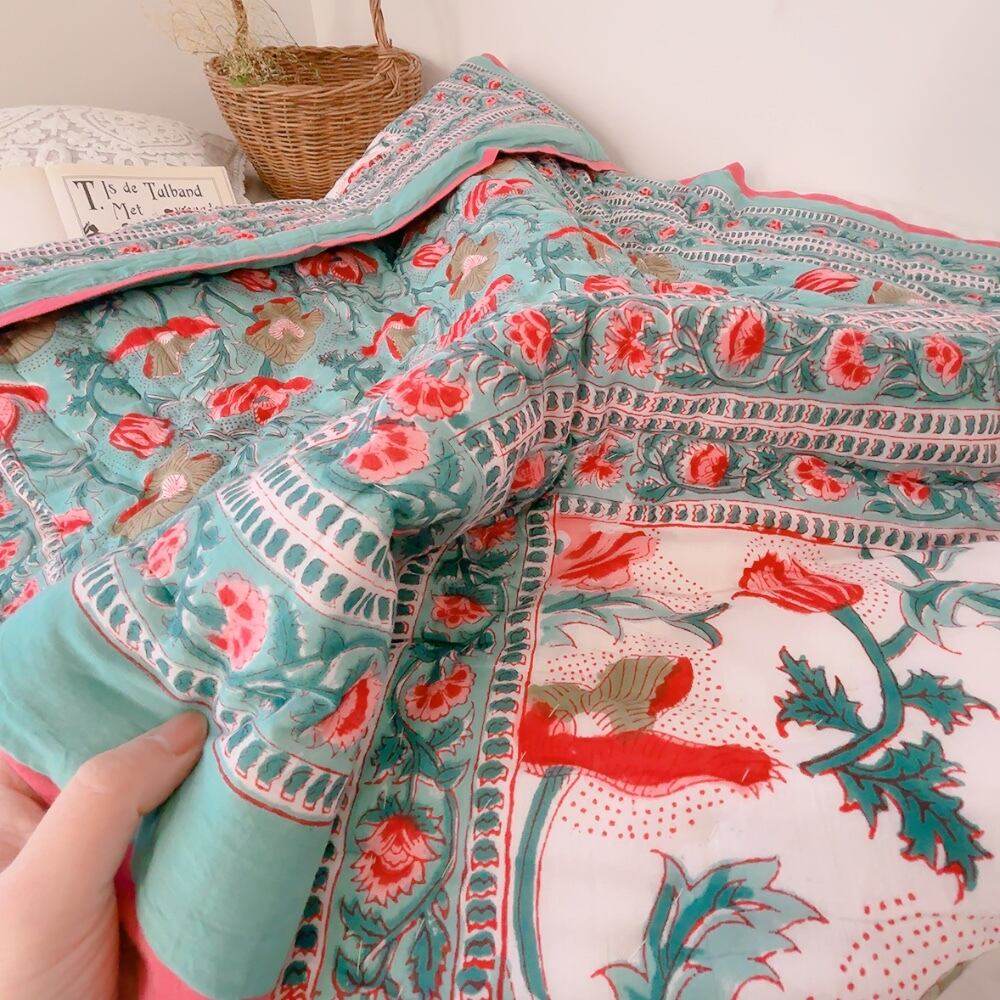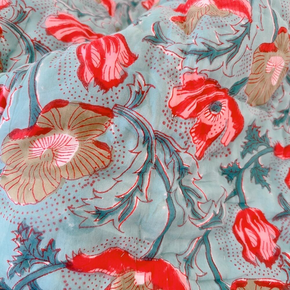綿入り【big baby】グリーンフラワー ブロックプリントキルト
