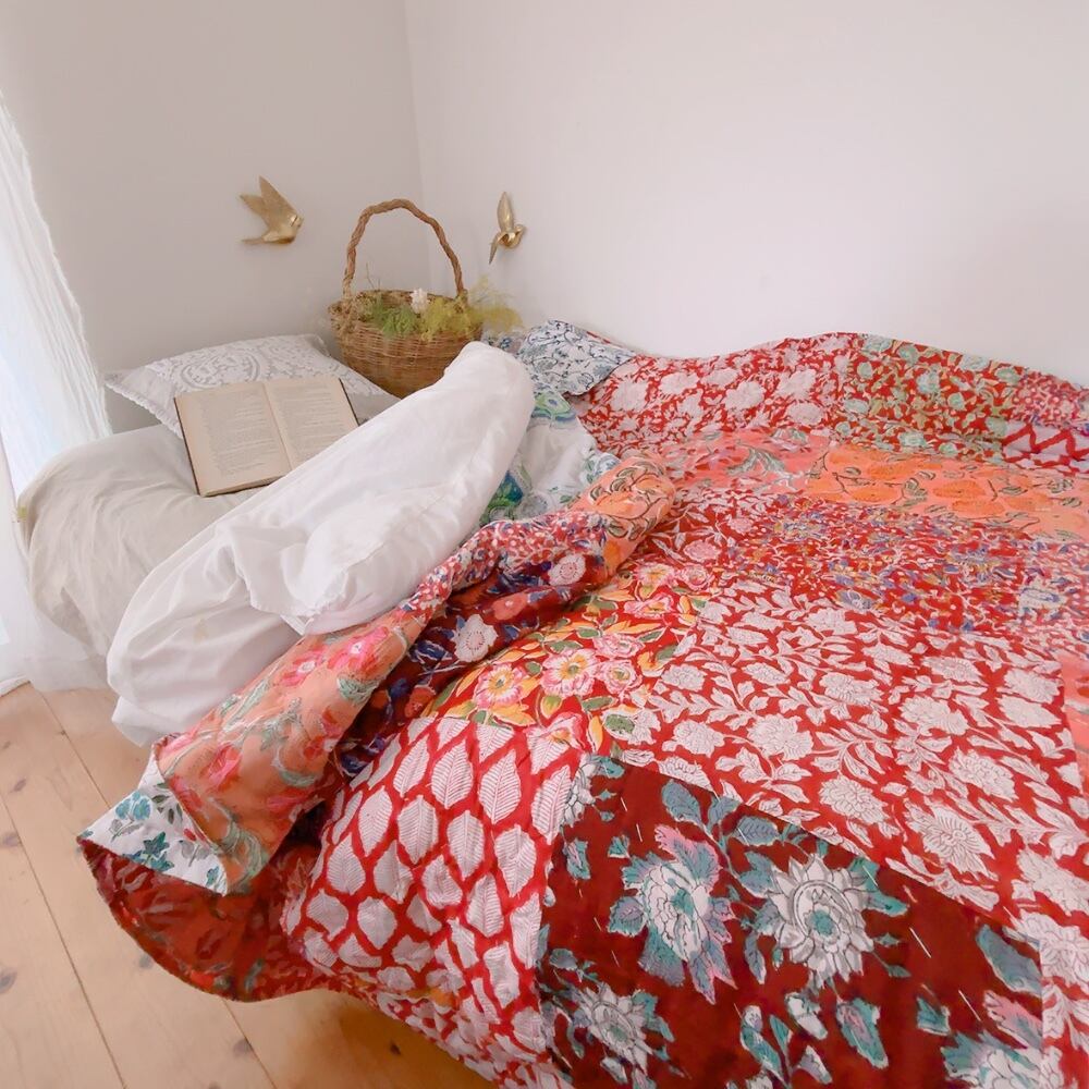 片面はホワイト系のブロックプリントを集めたパッチワーク、もう片面はレッド系のブロックプリント生地を集めたパッチワークの綿入りキルトです。